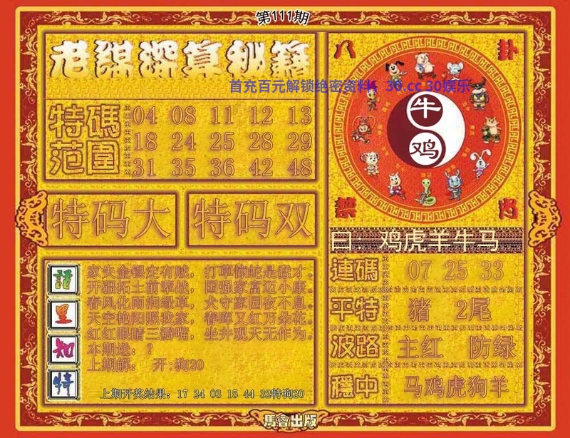 116期:密门仙机/心水特码信/黄大仙天书/波色生肖诗/生肖歇后语