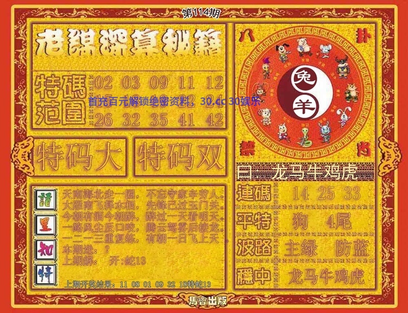 116期:特码预测版/六合独家料/小财神送码/三字联/曾道人玄机字